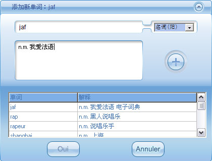 【汉法翻译】在文本栏中输入中文后点击‘法译汉’按钮(快捷键 回车Enter),即在解释栏中显示有此中文含义的法语单词词条列表,双击列表单词可详细查看解释(英汉翻译方法相同)。
