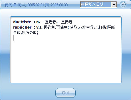 用户可以在每次软件启动时显示所添加的复习单词,或点击‘添加\查看复习’按钮直接浏览这些单词,在弹出的复习窗口中按时间顺序显示单词和解释,用户也可选择任何一日的单词来复习。