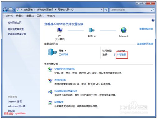 在网络和共享中心的页面中选择并点击打开“本地连接”,如下图红色方便标注所示