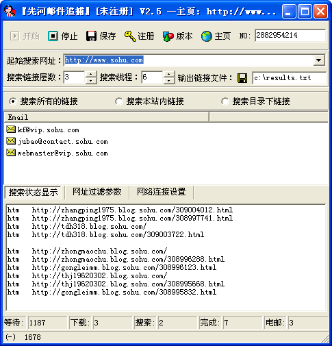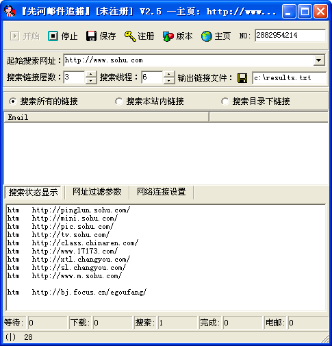 先河邮件追捕可以设定链接搜索层数最大到100层,同步搜索线程最大到100个,并且允许包含或不包含某些字符的网址过滤屏蔽,支持代理服务器搜索模式,可以同步将搜索到的纯网址链接和电邮分别以文本文件格式保存。可以明确搜索范围,指定其只搜索某个网站内的电邮、某个网址目录下的电邮或毫无限制地一直搜索下去,是一款从网站页面上搜集邮件地址的最佳工具。