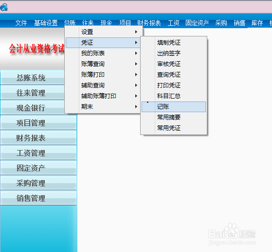 首先,在用友T3界面里面点击“总账”——“凭证”,选择“记账”,如下图