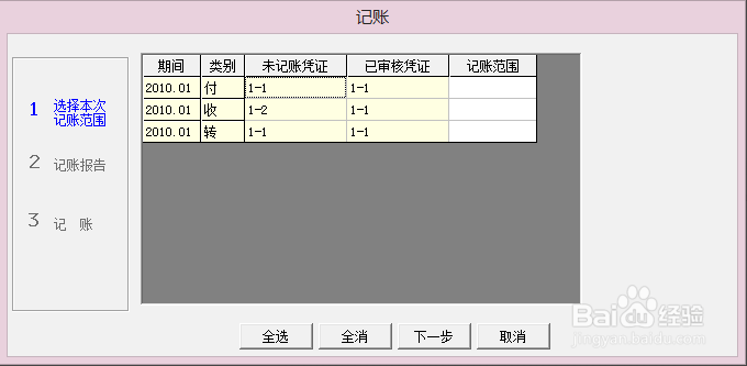 总共有三步,第一步是“选择本次记账范围”,大家想对哪张凭证记账就选那张,我这里是全部都选上了,全部都进行记账。如下图