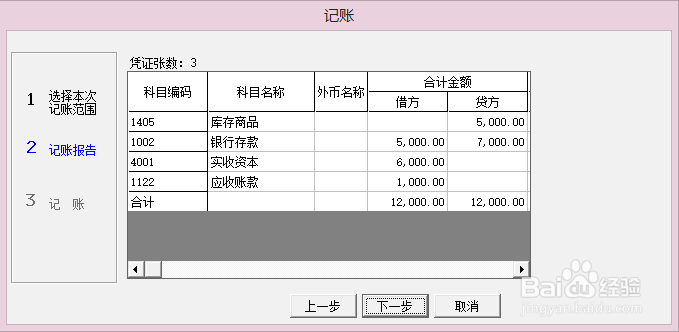 选好后就点击“下一步”,这时会到第二步“记账报告”,如下图,总共会对三张凭证进行记账,涉及的账户有库存商品、银行存款、实收资本和应收账款。