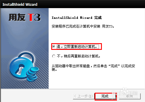 选择立即重启计算机,点击“完成”。到此,用友T3已经成功安装!