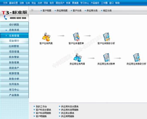 用友T3标准版包括三个系列12个产品,覆盖企业财务、业务、决策三个管理层次。财务系类软件以总账系统为核心,包括往来、现金项目、工资管理、固定资产等,为企业的会计核算和财务管理工作提供了全面、详细的解决方案。