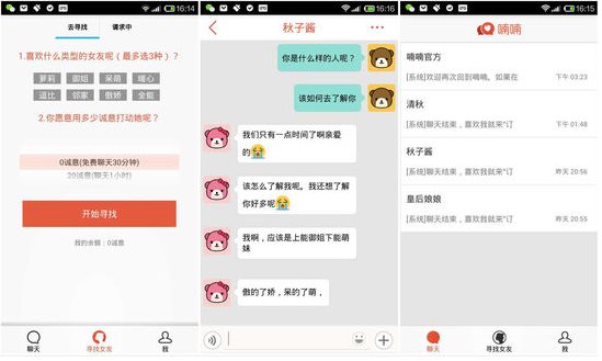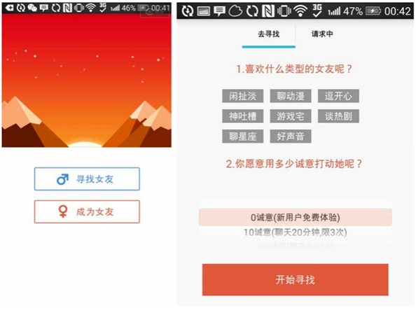 寻找女友分两个步骤,首先选择女友的类型(包括闲扯淡、逗开心、好声音等),其次选择聊天时间,从 1 小时到 1 周不等,每个男生有 30 分钟的体验时间。