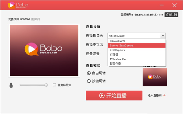 打开网易bobo视频客户端,选择直播摄像头及麦克风,设置好后,点击开始直播,预览直播画面;