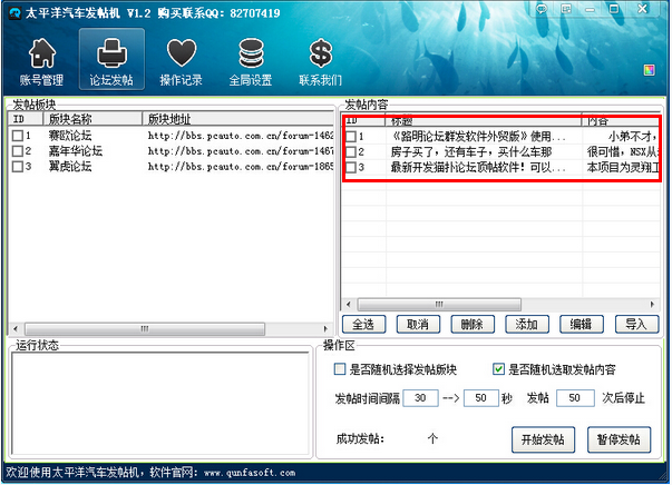 太平洋汽车发帖机是一款专为太平洋汽车论坛制作的自动发帖顶帖工具,太平洋汽车论坛是一个专门为各种汽车爱好者准备的交流平台,在这里大家能够直接进行各种推广,适合向用户们推荐各种汽车相关产品,太平洋汽车发帖机自动帮你进行发贴、跟帖操作。