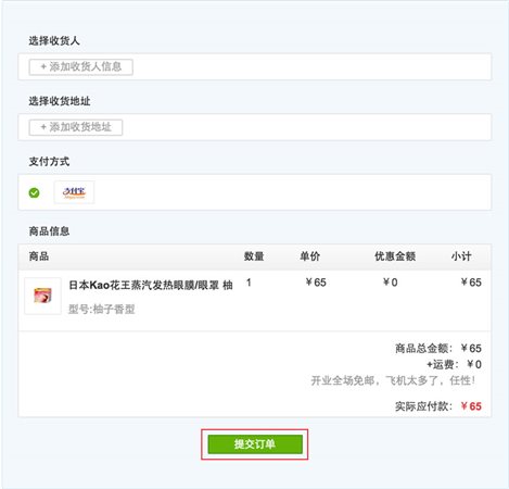 在此页面填写收货人(目前只填写收货人真实姓名,身份证号即可),收货地址,支付宝(目前顺丰海淘仅支持支付宝付款),确认商品信息无误后,点击提交订单。