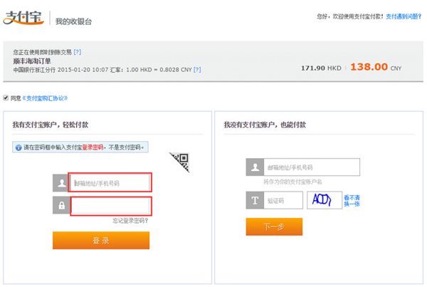 点击去支付,输入支付宝账号和登录密码,进入支付宝页面。