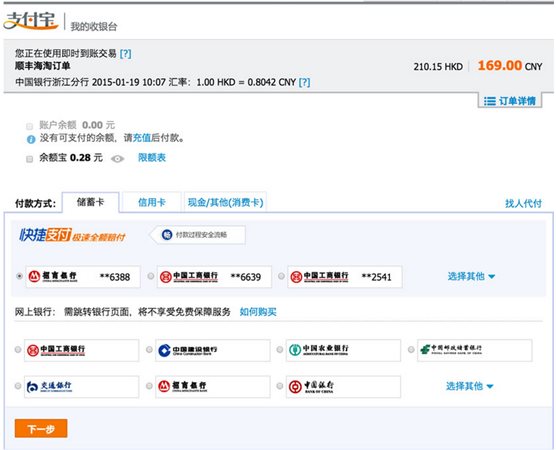 在支付宝页面,您可以选择支付宝余额、快捷支付、信用卡、储蓄卡支付,点击确认付款即可成功。