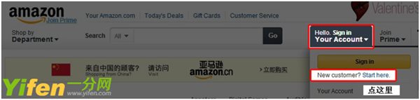 1、登入www.amazon.com,在右侧可见如下图,将鼠标移到灰色处(hello.sign in),会显示拉伸框,点击“start here”,即可开始注册。