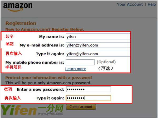 2、点击“start here”后,会出现如下图,根据要求准确填写内容,右侧有中文翻译,填写完成后点击“create account”即可。