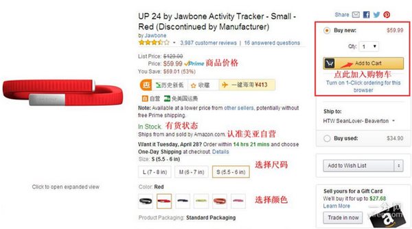 1、比如你准备购买Jawbone卓棒 UP 24 智能手环,在其中选择好“颜色”、“大小”等属性,确认好后点击右侧的“add to cart”即加入购物车。