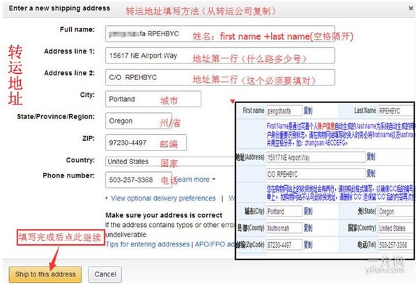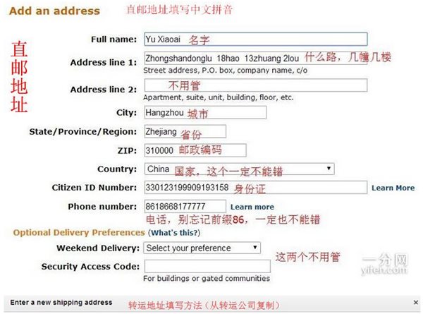 1、一般美亚可分为直邮地址或转运地址,直邮地址填写国内收货地址(用汉字拼音即可),转运地址填写自己所选择的海外转运公司仓库地址(免税州),这里我推荐转运四方【去注册】。