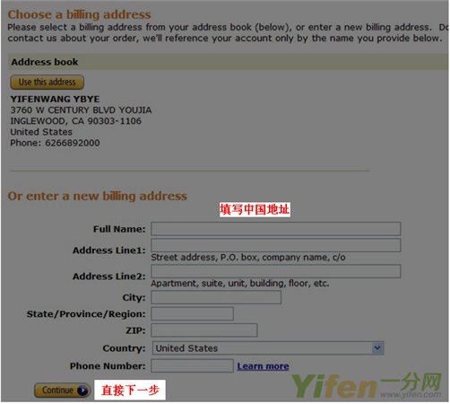 你可以选择上面已有的地址作为账单地址,也可以下面写一个新的账单地址。账单地址建议填写中国自己的地址,名字请千万不要用转运公司给的名字,而是用自己信用卡的名字。