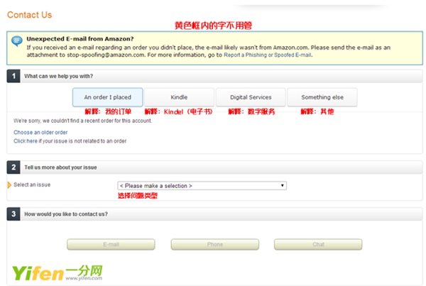 上面第一步中分别选择你需要帮助的类目(①我的订单 ②kindel ③数字服务 ④其他),一般我们选择第一个我的订单【an order i placed】就可以。注意:选择订单后,系统会列出你的订单记录,让你选择你需要帮助的订单。如果不是,你可以取消。