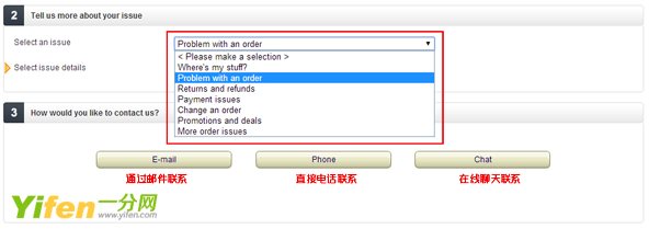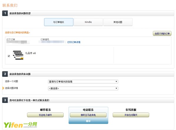 选择好问题类型后,就可以选择下面第三步中的三个联系方式。如果你的英语够厉害,那么你可以直接电话联系或者在线交流。提示:选择电话联系后,亚马逊会在几分钟内你打电话。