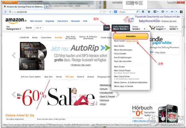去amazon.de,如果注册过账号,就按大橙色按钮直接登陆;如果没有账号,注册一个。