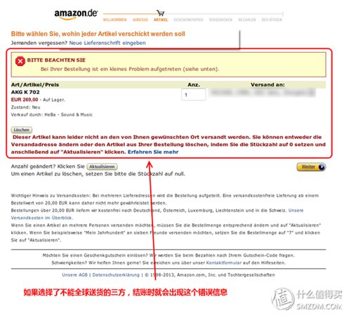 这里要注意一下上图中红框框里的字,要选择德亚自营发货的商品。如果不是自营发货可能就不能发往国外。如果选择了非自营的商品,会怎样呢?杯具是这样的: