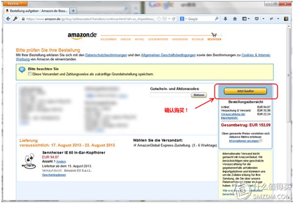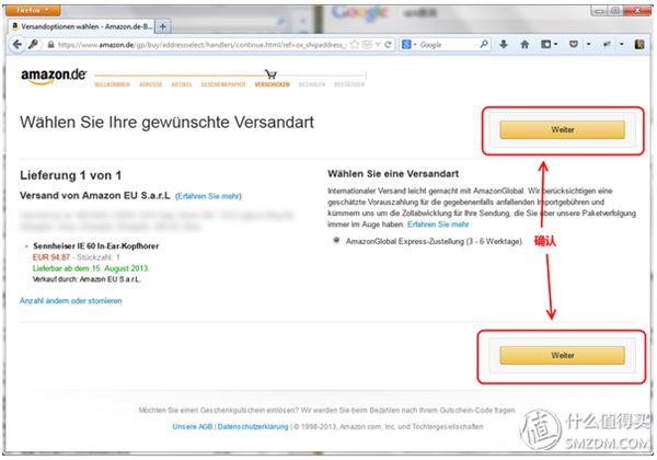 添加完配送信息之后,就可以确认购买了。如果刚才的地址中“区域”选择了“中国”那么这里只有默认的亚马逊全球直邮服务可选,如果选择了别的地区,就还有另一种快递,我们之后慢慢说。