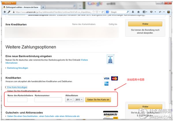 确认完配送之后,就可以来到了信用卡信息的地方啦~首先使用某个地址的时候,需要添加并确认信用卡信息。注意,是首次使用新地址,也就是说,即使你以前在德亚上买过东西,但这次使用了一个地址,就还要再添加和确认信用卡的信息(系统会提示)。