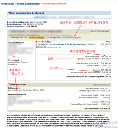 这是一张在购买德亚IE80直邮中国大陆的订单信息。德亚IE80日常价格是199欧,由于是国外购买,在结算时首先免去了德国国内的消费税,得到167.23欧的价格,然后,31.19是德亚使用的UPS国际速递的运费,另外还有一部分就是进口到中国大陆的进口税——28.33欧。于是,这样算下来,整个的费用就是226.75欧,由于我使用的是招行的美元双币Visa卡,中间还有一个转换汇率,最后到我手里的美元价格是306.07美元——按目前的汇率来说,折合1888.45元人民币。