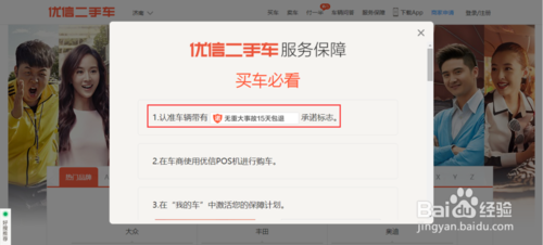 1.首先在起点软件园下载优信二手车app,2.点击app打开软件首页,首先会弹出优信二手车服务保障,通过官网买车前必看,如下图所示。