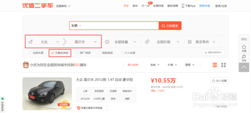 4.在搜索车辆信息时,可以勾选无事故承诺选项,这样有助于你买到性能更好的车辆,如下图所示。