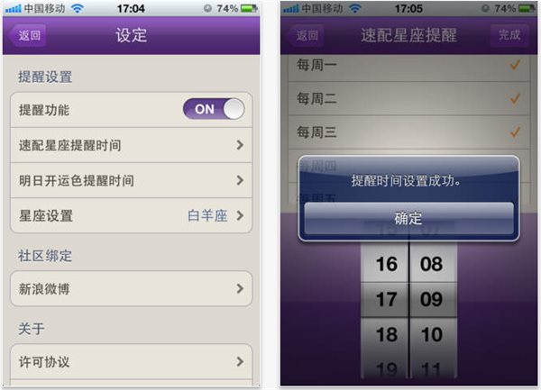 2、每天的幸运色及速配星座信息个性化定制推送功能,用户可根据习惯,设定每日幸运色及速配星座提示信息,让你随时随地了解开运指南,把好运随身携带!