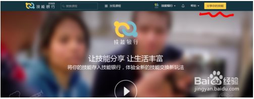 1、进到技能银行官网之后你会看到如下图片,点击右上角的“分享你的技能”。