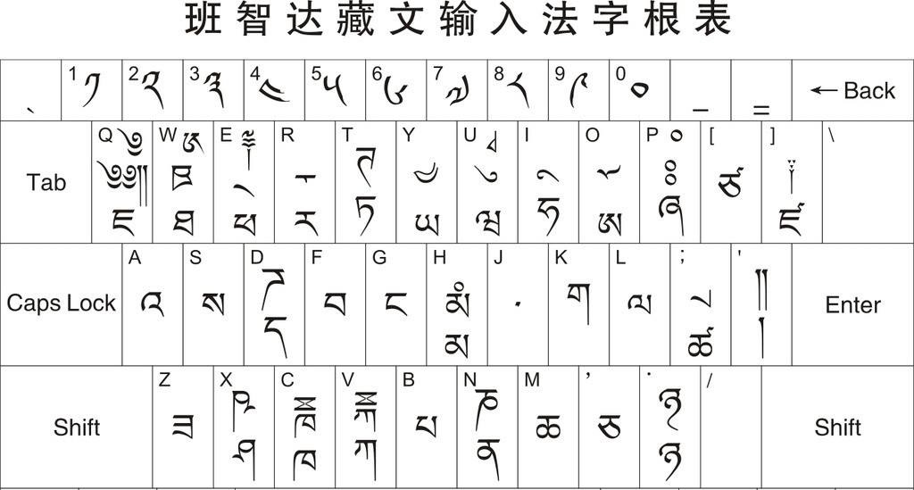 在键盘的布局上以藏文为主,梵文为辅。藏文字符也是梵文的主体字符,在日常生活中梵文的应用是少量的,因此,藏文键位分配在键盘的最佳位置上,梵文键位放在次要的键位上。