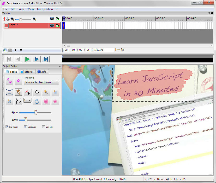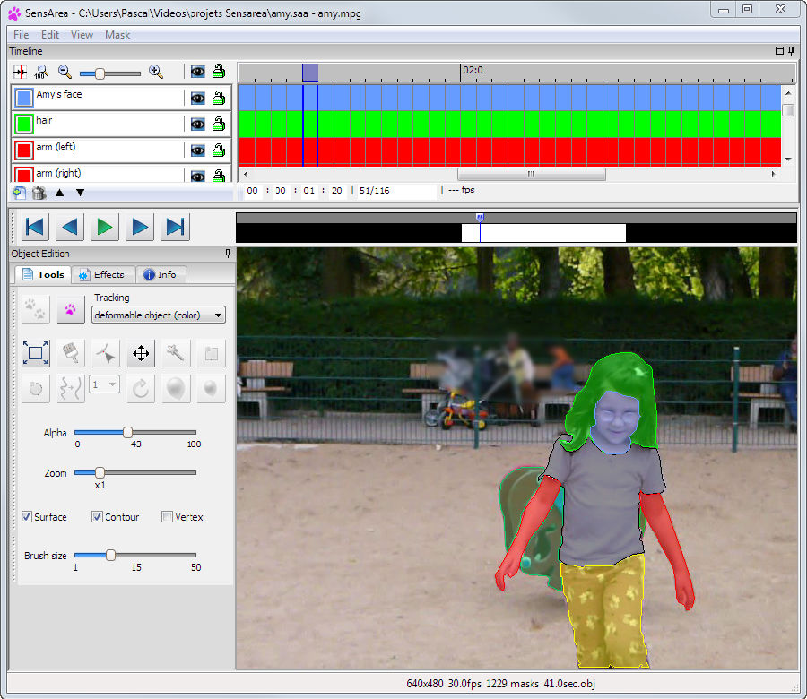 Senasarea视频编辑器可以通过模糊选择视频中的某个对象,例如人物或物体,对其进行特效添加等二次处理。可将编辑处理后的视频保存输出为AVI格式、图像或SWF格式。【使用说明】