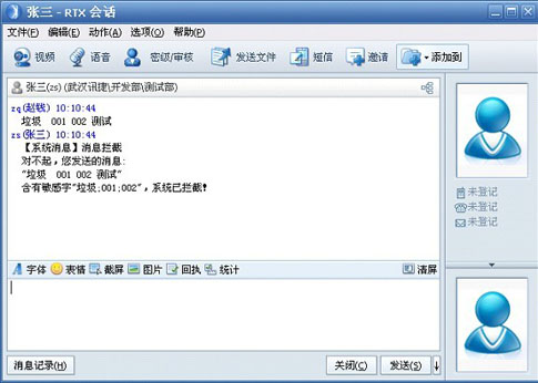 聊天收发文件监控:能监控员工使用RTX聊天的内容,可以方便管理者对员工的聊天行为进行管理,有助于企业信息的安全性,保密性,同时避免员工上班时间过度聊与工作无关的内容。