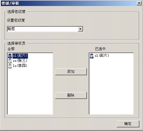 在服务器端支持用户的分类,即机密级用户和秘密级用户;支持部门审批人员的调整,管理人员可以调整部门的审批人员,可指定部门领导或科领导等;审批时支持多名领导的同时审批,即将数据包发给多个领导,当一个领导审批结束后,其他领导的审批请求自动结束,相同密级的用户之间发送消息不需要审批。