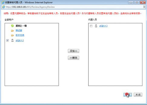 设置代理审核后,审核通知将不在发送给审核人员,而是发送给代理人员!作为代理审核人员设置其他代理人员时,自身将失去审核权限。