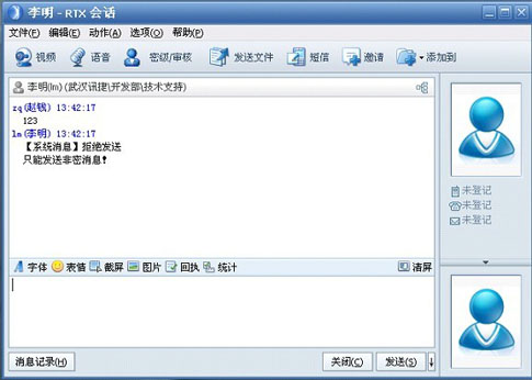 RTX一条消息本身有字数的限制,但安全保密管理员设置的字数限制小于RTX本身的字数限制时系统将拒绝发送消息,并给出提示消息;当系统管理员设置的字数限制大于RTX本身的字数限制时,系统自动将消息拆分为多条发送。 由安全保密员设置字数,假如设置为10个字,当用户发送字数大于10个字时: