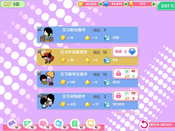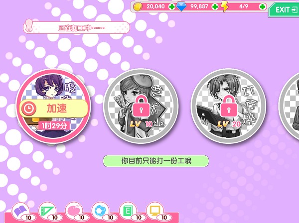 打工是有等级和学习属性要求的,在前期等级和属性都不高,能选择的工作也是比较少的(还好没有坑爹到一个工作都不能做!),越低级的工作需要的时间越短,但是钱也少。有以下两个选择:直接选择低级的工作;或先去学习满足高等级工作的需求。个人比较推荐先去学习,满足一个性价比高的工作,因为在游戏前期等级和需求的属性都不会太高,学习一两次就能满足了。当然,土豪可以无视这点,土豪可以直接花费钻石,跳过需求属性和等级,进行一次打工。