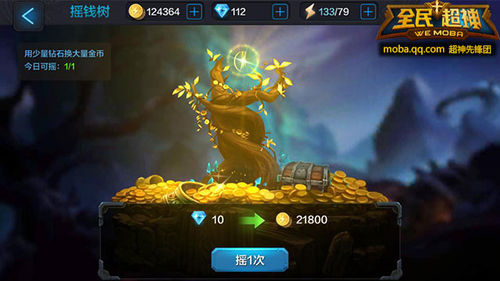 B板块:从左到右分别是金币、钻石和体力的具体数值,点击数值后的“+”,能进入如何快速增长货币或体力的相关页面。如点击金币,会进入摇钱树系统,消耗钻石可兑换大量金币。