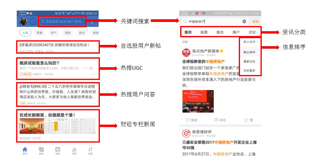 (2)雪球为用户提供浅入口深内容的信息搜索方式。用户可以针对自己的需求在首页进行关键词搜索,搜索行为覆盖产品的所有功能,用户可以根据搜到内容是否满足需求再针对性的选择分类和排序。