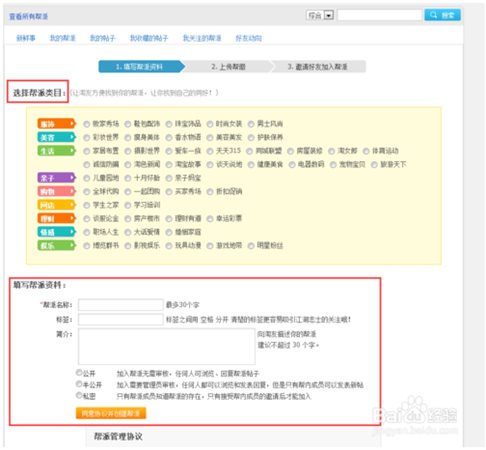 5、我们看到下面的内容,根据上面的提示,我们按步骤填好资料就可以创建自己的帮派了