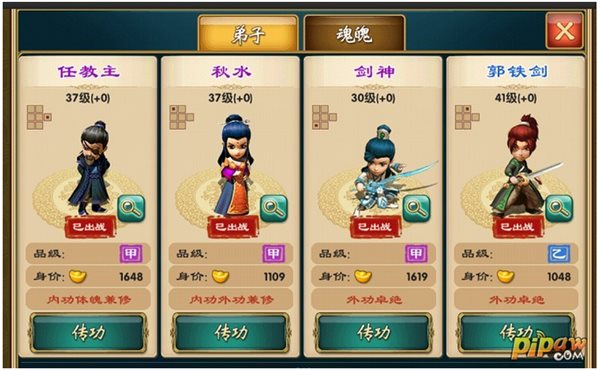 点评:利用强力阵首上官帮主,加上阿飞和无命两大输出型乙级弟子,不算太难刷的组合,效果却很好,有肉盾有输出,强烈建议玩家们采用这个开局!
