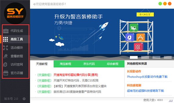 誓言装修助手是一款专为淘宝店主制作的淘宝装修设计辅助软件,这款软件可以帮助用户一键装修淘宝店铺,拥有代码快速生成功能,支持快速生成通用全屏代码、通用轮播代码、首页视频海报、多层固定背景、淘宝留言板、固定背景代码、返回顶部代码等常用淘宝店铺装修代码,并集成了修复图片地址、切片批量加链接、代码预览器、一键下载主图等高级工具,还提供了双11、双12的活动模块,为淘宝店家店铺装修提供便利。