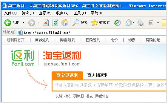 请在返利网首页点击“淘宝返利”或在浏览器输入taobao.51fanli.com,进入淘宝返利频道