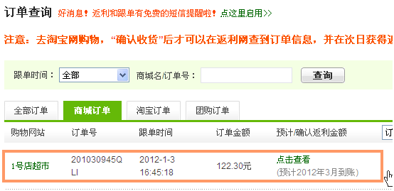 注:在购物网站成功提交订单30分钟内,请您进入我的返利网-订单查询中查询您订单是否被成功跟踪