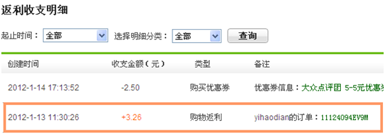 注:您可以在我的返利网-返利查询到账户余额和收支明细,团购返利订单一般为1个月后到账 您还可以进入我的返利网-订单查询,如订单状态由“等待返利”变为“已返利”,说明该笔返利已进入您的返利网账户