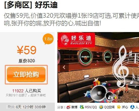 点击“立即抢购”按钮前往购买页面,需要您登录团购网站;为了确保您能够拿到返利,建议您点击确认提交订单后,30分钟内到
