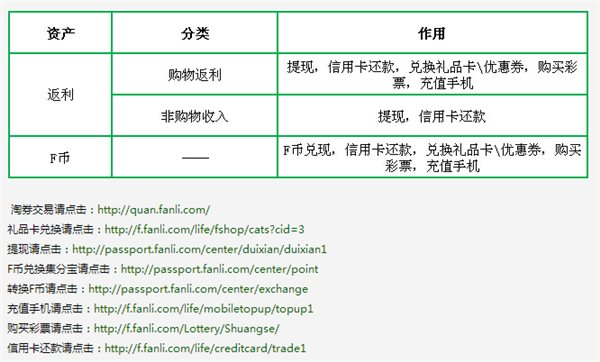 返利网的返利资产分为返利和F币。详细使用权限如下图: