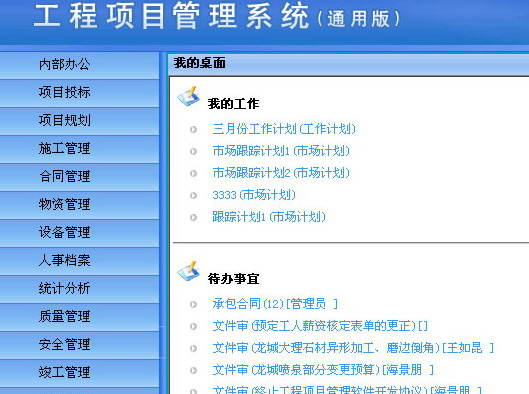 建筑工程项目管理软件主要功能包括:投标管理、项目信息,项目计划、材料管理、人事管理、设备管理、施工管理、资金管理、合同管理、知识管理、成本管理、分包管理、企业办公(OA)管理、辅助决策(领导报表查询)、系统管理等功能。