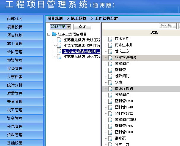物资管理:包含物资有关的采购计划、采购合同、订单、采购收退货,甲供料业务处理以及各种领用、盘点等管理,并按项目进行归集。